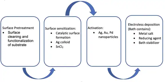 Electroless deposition (ED) or electroless plating is defined as the autocatalytic process through which metals and metal alloys are deposited onto conductive and nonconductive surfaces.[1][2][3][4] These nonconductive surfaces include plastics, ceramics, and glass etc., which can then become decorative, anti-corrosive, and conductive depending on their final functions.[2] Electroplating unlike electroless deposition only deposits on other conductive or semi-conductive when a external current is applied.[5][6] Electroless deposition deposits metals onto 2D and 3D structures such as screws, nanofibers, and carbon nanotubes, unlike other plating methods such as Physical Vapor Deposition ( PVD), Chemical Vapor Deposition (CVD), and electroplating, which are limited to 2D surfaces.[7] Commonly the surface of the substrate is characterized via pXRD, SEM-EDS, and XPS which relay set parameters based their final funtionality.[5] These parameters are referred to a Key Performance Indicators crucial for a researcher’ or company's purpose.[5][8] Electroless deposition continues to rise in importance within the microelectronic industry, oil and gas, and aerospace industry.[9]