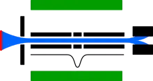 The positive ions produced in the region where the atoms intercept the electron beam are tightly confined in their motion by the strong attraction exerted by the negative charge of the electron beam. Therefore, they orbit around the electron beam, crossing it frequently and giving rise to further collisions and ionization. To restrict the ion motion along the direction of the electron beam axis, trapping electrodes carrying positive voltages with respect to a central electrode are used.