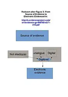 Electronic evidence can be abbreviated as e-evidence, and this shorter term is gaining in acceptance in Continental Europe. This page covers mainly activity there and on the international level.[2]