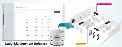 - Label management software: Responsible for the configuration of the system, configuration of the properties on the label itself, and to update the database for the list of prices Typically, a centralized software that is responsible for the building of and maintenance of the network for the data communication between the label management software and the terminal display.[5]