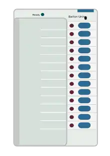The control unit is with the presiding officer or a polling officer and the balloting Unit is placed inside the voting compartment. The balloting unit presents the voter with blue buttons (momentary switch) horizontally labeled with corresponding party symbol and candidate names. The Control Unit, on the other hand, provides the officer-in-charge with a "Ballot" marked button to proceed to the next voter, instead of issuing a ballot paper to them. This activates the ballot unit for a single vote from the next voter in the queue. The voter has to cast his vote by once pressing the blue button on the balloting unit against the candidate and symbol of his choice.