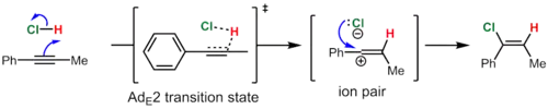 In contrast, phenylpropyne reacts by the AdE2ip ("addition, electrophilic, second-order, ion pair") mechanism to give predominantly the syn product (~10:1 syn:anti). In this case, the intermediate vinyl cation is formed by addition of HCl because it is resonance-stabilized by the phenyl group. Nevertheless, the lifetime of this high energy species is short, and the resulting vinyl cation-chloride anion ion pair immediately collapses, before the chloride ion has a chance to leave the solvent shell, to give the vinyl chloride. The proximity of the anion to the side of the vinyl cation where the proton was added is used to rationalize the observed predominance of syn addition.[7]