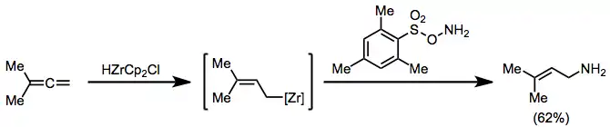 Allylic metal species can be used to prepare allylic amines through electrophilic amination. Although allylic amines are usually prepared through nucleophilic amination of allylic halides, a few examples of electrophlic amination of allylic substrates are known. In the example below, an allylic zirconium reagent (obtained by hydrozirconation) is trapped with an O-alkylhydroxylamine.[26]