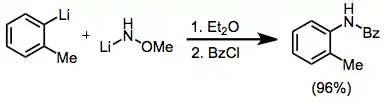 - Beak, Peter; Selling, Gordon W. (1989). "Displacements at the nitrogen of lithioalkoxylamides by organometallic reagents". J. Org. Chem. 54 (23): 5574–80. doi:10.1021/jo00284a034.