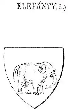 The exact origins of the family are unknown. Some authors believe the Elefánthy to be a branch of the Ludány kindred, which itself was a branch of the genus Hont-Pázmány.[1] The eminent 18th-century polymath Matthias Bel, in his Notitia Hungariae novae historic-geographia, writes that a 12th-century ancestor of the family was part of King Coloman's delegation to Sicily to propose a royal marriage. This ancestor was gifted an elephant in Sicily, which he brought back and presented to the King, who in return gave him the original estates in Nyitra County.[2]