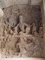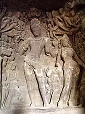 The northern entrance to the cave is flanked by two panels of Shiva dated to the Gupta period, both damaged. The left panel depicts Yogishvara (Shiva as the Lord of Yoga) and the right shows Nataraja (Shiva as the Lord of Dance).[26] The Sadashiva is flanked by two large friezes, one of Ardhanarishvara and the other of Gangadhara.[27] The walls of the mandapa feature other Shaivism legends. All the friezes, states Stella Kramrisch, feature the vyaktavyakta concept of Samkhya, where the state of spiritual existence transitions between the unmanifest-manifest, the figures leap out of the cave walls towards the spectator as if trying to greet the narrative. Even the manifested Sadashiva is shown to be rising out of the rocks.[27]