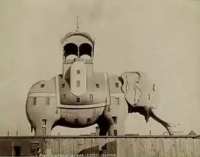 The Elephantine Colossus (also known as the Colossal Elephant or the Elephant Colossus, or by its function as the Elephant Hotel) was a tourist attraction located on Coney Island in Brooklyn, New York City. It was built in the shape of an elephant, an example of novelty architecture. The seven story structure designed by James V. Lafferty stood above Surf Avenue and West 12th Street from 1885 until 1896, when it burnt down in a fire. During its lifespan, the thirty-one room building acted as a concert hall and amusement bazaar. It was the second of three elephant buildings built by Lafferty, preceded by the extant Lucy the Elephant near Atlantic City and followed by The Light of Asia in Cape May.