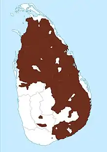 By the turn of the 20th century, elephants were still distributed over much of the island.[13] The area currently known as Ruhuna National Park was the Resident Sportsmen's Shooting Reserve, an area reserved for the sporting pleasure of British residents in the country.[16] In the early 20th century, mega reservoirs were constructed in the dry zone for irrigated agriculture. Ancient irrigation systems were rehabilitated and people resettled. This development gathered momentum after the independence in 1948. As a result, elephant habitat in the dry zone was severely fragmented.[17]