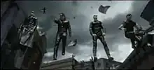 Set with Lara Croft along with Bono, the music video also acts as a short film with its story about the rescue of the Edge (inserted into footage from Lara Croft: Tomb Raider) from the "evil U2". It begins with Bono receiving a phone call in the middle of a crowded New York street from his evil counterpart known as "evil Bono", who states that they have captured The Edge and demands for "the key". The evil counterpart announces that Bono himself is surrounded before ending with the words "not even Lara Croft can help you now", which puzzles Bono. After escaping and rescuing civilians from several of the "evil U2's" murder attempts, the band reunites and performs a "rock-off" against their evil counterparts, which ends with the "good U2" emerging victorious. The "good U2" join forces with Lara and leave the scene for an unknown place, passing a street with levitating vehicles and a pachyderm (remnants of the "evil U2's" crimes), ending with a Boeing 747-400 flying overhead before fading to black (the plane is also seen at the very beginning of the video).