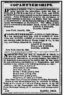 Peck's association with Anson G. Phelps laid the foundation for the creation of Phelps, Dodge & Co., a business that became the dominant importers of metals into America, and the dominant exporters of tin-plate from Britain for half a century. The company eventually became one of the largest copper mining and copper producing concerns in the world.[19]