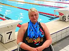 In 2006, she started to participate in competitive swimming again when she joined the Stadium Masters Swimming Club. In 2008, she qualified for the FINA World Masters Championships and swam a personal best time in the 800m Freestyle.[3] From 2007 to 2009, she competed in several swimming events in a variety of strokes and distances around Australia in the women's 55–59 age group.[22] In October 2007, at the 11th Australian Masters Games, she won 7 individual gold medals and a 1 gold in a relay as a disabled swimmer. She also won a bronze medal in a member of a team in an abled bodied relay event.