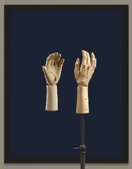 Her miniaturized figures have been made in porcelain, wood, glass and brass, and employed disconcertingly lifelike details such as gently raised veins, creases and wrinkles, eyebrows composed of her own collected lashes, hand-blown glass eyes and functioning joints.[8][43][4] Their operations can involve hidden spring-loaded elements, magnets, pendulums and fiber optics, and visible hinged doors and exposed joints that intentionally break with illusionism.[16][2][44] The joints, magnets and components that allow a sculpture to be posed and moved are an essential part of the finished image, with both sculpture and mechanism working equally to represent the alive, moving body. Writing about King's exhibition, "Attention's Loop" (Mary Ingraham Bunting Institute, 1997), Marty Carlock suggested that such "peculiar dichotomies" created an aesthetic tension that fed into viewers' fascination with how both machines and humans work.[25]