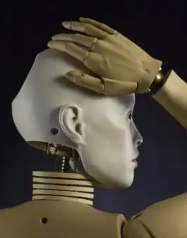 Elizabeth King is an American sculptor and writer known for movable figurative sculptures that she has employed in stop-frame animations.[1][2][3] Her work combines exacting handcraft, elementary mechanics, and digital and electronic technologies, applied in sculptures of half or full figures (generally scaled at half life-size), heads, arms and hands, or even simply eyes.[4][5][6] She often equips figures with subtly illuminated eyes and visible and invisible mechanisms enabling the performance of anatomically correct simple operations, seemingly of their own volition.[7][4][1] Writers have described her figures as "insistently nonhuman" yet "uncannily alive"[8] in their ability to project self-awareness, intelligence, agency and emotion.[9][10] They reflect her interests in early clockwork automata, the history of the mannequin and puppet, literature involving unnatural figures come to life, and human movement.[8][11][12] Art in America critic Leah Ollman wrote that King's "highly articulated automatons invite us to consider how consciousness arises from physical being … she portrays her mechanical surrogates as convincingly self-aware, while we are left to ponder that age-old question: where exactly does the self reside?"[8]