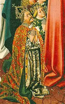 Elizabeth was born into the powerful House of Luxembourg. Her parents were the 41-year-old King Sigismund of Hungary and his second wife, the 17-year-old Barbara of Cilli.[10] Hrvoje Vukčić Hrvatinić, the rebellious baron with whom Sigismund had recently come to terms, was the infant's godfather.[11] The year after her birth, Elizabeth's father was elected King of the Romans.[12] As the king's only child, Elizabeth was seen as de facto heir presumptive to the throne, or at least as the princess whose eventual marriage would provide a king.[13] In 1411, Sigismund managed to have the Hungarian estates promise that they would recognize Elizabeth's right to the Holy Crown of Hungary and elect her future husband as king –an agreement that would have great consequences after Sigismund's death.[14] Elizabeth's hereditary right was in fact rather slim, as her father had acquired it by marrying his first wife, Queen Mary, from whom Elizabeth was not descended.[15] The same year, Sigismund betrothed Elizabeth to the Habsburg Duke Albert V of Austria, then aged 14.[16]