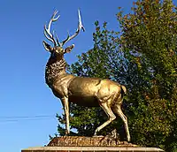 The Elk sculpture in front of the Benevolent and Protective Order of Elks, Milwaukee Lodge portrays an elk made out of zinc painted gold and brown. The elk stands erect with his head turned 10 degrees to the proper left. His front legs are straight and parallel, while his proper left hind foot is in front of his proper right leg. The sculpture's base depicts a forest floor, including a small broken tree stump on the proper left. The sculpture stands on a brick base that displays advertisements for the lodge.[2] There is a plaque on the base with the Elks Lodge logo.