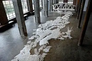 Ellen Driscoll (born 1953) is a New York-based American artist, whose practice encompasses sculpture, drawing, installation and public art.[1][2][3] She is known for complex, interconnected works that explore social and geopolitical issues and events involving power, agency, transition and ecological imbalance through an inventive combination of materials, technologies (rudimentary to digital), research and narrative.[4][5][6] Her artwork often presents the familiar from unexpected points of view—bridging different eras and cultures or connecting personal, intimate acts to global consequences—through visual strategies involving light and shadow, silhouette, shifts in scale, metaphor and synecdoche.[5][7][8] In 2000, Sculpture critic Patricia C. Phillips wrote that Driscoll's installations were informed by "an abiding fascination with the lives and stories of people whose voices and visions have been suspended, thwarted, undermined, or regulated."[2] Discussing later work, Jennifer McGregor wrote, "Whether working in ghostly white plastic, mosaic, or walnut and sumi inks, [Driscoll's] projects fluidly map place and time while mining historical, environmental, and cultural themes."[1]