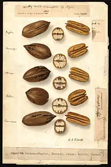 Schutt worked for the United States Department of Agriculture between 1904 and 1914, part of a select cadre of illustrators that included Deborah Griscom Passmore, Amanda Newton, Royal Charles Steadman, J. Marion Shull, and Elsie Lower. During this period, she painted over 700 watercolors of fruits and nuts for the USDA.[4] Her subjects ranged from the common (apples, hickory nuts) to the then-exotic (bael, custard apple, cashew nuts), and quite a few show fruit damage from molds, insects, and other causes. Her precise and rather dry style resulted in watercolors that at times look more like drawings than paintings. She signed her USDA watercolors 'E.I. Schutt'. She also modeled some fruit such as apples and pears in wax to demonstrate the effects of long storage and packaging upon fruit.[5] She contributed a few drawings of plant specimens collected in Mexico to Britton and Rose's definitive work on cactus.[6]