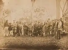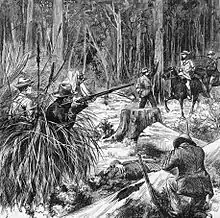The police had received information that the Kelly gang were in the Wombat Ranges at the head of the King River and, on 25 October 1878, two mounted police parties were dispatched to search for them. One party, consisting of Sergeant Michael Kennedy and constables Michael Scanlan (sometimes spelled Scanlon), Thomas Lonigan and Thomas McIntyre camped overnight in an abandoned mining site at Stringybark Creek, about twenty-five miles north of Mansfield.[47] They were unaware that they were only 1.5 miles from the Kelly gang's hideout[48] and that Ned had observed their tracks.[47]
