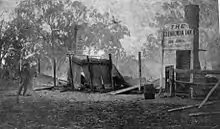 Back at the barracks, the gang secured the two policemen and two post office workers in the lockup and prepared to leave with the proceeds from the bank robbery, the police horses and police weapons. Mrs Devine was threatened with reprisals if she released the prisoners before 7.30 p.m. Dan and Byrne then rode out of Jerilderie. Ned and Hart rode back into town where Ned stayed a short while, drinking at the Albion (Traveller's Rest) Hotel with the strangers who had recently entered the town and were soon to leave. While there, the local parson, John B. Gribble, persuaded Ned to leave the race horse he had taken as it belonged to "a young lady".[88] When Kelly and Hart left, they were not seen again by the police for 17 months.[89]