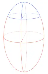 Graphical illustration of an ellipsoidal dome. Note the blue and red "ellipses" are circles, at an angle. The blue and red ellipse is rotated, about its vertical axis. At top in blue is a prolate ellipsoidal dome.