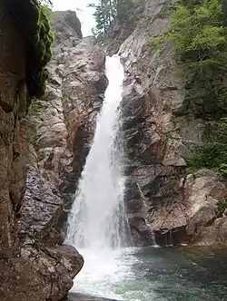 The river leaves the level ground at the high point of the notch by dropping 64 feet (20 m) over Glen Ellis Falls. The falls are a short walk from Route 16, the highway through the notch. A U.S. Forest Service parking area, not far from the top of the falls, gives access to a well-maintained, hard-surfaced, short trail hugging the river to a point at the top of the falls, where there is a lookout nearly straight down into the gorge, and then the trail proceeds by a steep descent of stairs to the deep pool at the base of the falls.