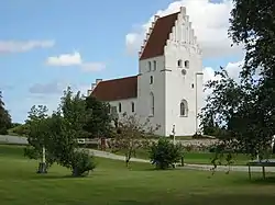 Elmelunde Church, famous for its frescos, is located in the village of Elmelunde, Møn, in southeastern Denmark. It stands high above the surroundings just south of the main road from Stege to the white cliffs of Møn. The impressive whitewashed building can be seen from miles around and has been used as a landmark by sailors in the Baltic Sea.