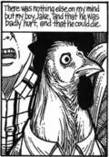 Jake glances through it and realizes it is a record of events after chickens gained human intelligence, beginning with Elmer's memories of the first day. He reads a random section in which Elmer and his brother Joseph were attacked by Ben. Jake confronts Ben and accuses him of only pretending to be his parents’ friend. Ben becomes angry and tells Jake that it was a different time, and that he would not understand. Ben reveals that there were a few chickens who became intelligent prior to 1979, and that he met one at the poultry where he worked. Ben recognized that the chicken was aware, but he beat it to death with a brick out of fear. This filled him with guilt, so when all chickens gained awareness he protected the three he could – Elmer, Helen, and Joseph. Ben suggests Jake read the whole diary from beginning and offers to add context if he can.