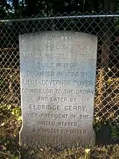 The Massachusetts government confiscated Oliver's property during the American Revolutionary War, and sold it in 1779 to Andrew Cabot. In 1787 Elbridge Gerry purchased the Cambridge estate, which became his home.[6] In the aftermath of the XYZ Affair, for which Gerry was unjustly criticized, Elmwood was the scene of protests in which Gerry was burned in effigy.[14] Gerry served as Governor of Massachusetts in 1810 and 1811; redistricting of the state in 1812 prompted the coining of the term "gerrymandering" to describe the practice of shaping legislative districts in partisan ways.[15] In March 1813 Gerry took the oath of office as Vice President of the United States in the house; he died in 1814 in Washington, D. C.[6] Gerry rented out large parts of the estate to tenant farmers.[16] He sold and later repurchased land near the Charles River from a relative, who operated a landing and storehouse; the area (located near the present-day Eliot Bridge) became known as Gerry's Landing.[17][18]