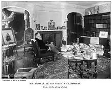 Lowell remained at Elmwood for the remainder of his life with a few exceptions, including the period between 1877 and 1885 when he served as Minister to Spain and Great Britain. At Elmwood, he wrote some of his best-known works, including The Vision of Sir Launfal, The Biglow Papers, and A Fable for Critics, all published in 1848.[32] It was Lowell who named the house "Elmwood". He mentions the home in some of his poetry:[33]