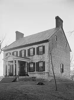 The brick house is two stories over a raised basement, with a center-hall arrangement on both levels. The brick on the side and rear elevations has glazed headers. The house is unusual in the location of a side door in the dining room on the gable end. A portico with a new entry door was added in the nineteenth century.[3]