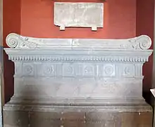 Already in early republican times patrician families hanged imagines with the corresponding tituli or elogia not at home anymore, but in public spaces too. Sponsors of sacred and state buildings often had the portraits of their ancestors with inscriptions affixed to these works. Appius Claudius Caecus (consul 307 and 296 BC) did so on the temple of Bellona, which he erected in 296 BC. Marcus Aemilius Lepidus, consul in 78 BC, did the same both in the Basilica Aemilia built by his ancestors and in his own house. Quintus Caecilius Metellus Pius Scipio (consul in 52 BC) had a whole crowd of gilded equestrian statues of his ancestors erected at a building on the Capitol.[10][11] Elogia in the Republican age were not confined to Rome. Among others, on the acropolis of Tarquinii have been excavated fragments of elogia of local citizens, useful for shedding light on the Etruscan aristocracy.[12]