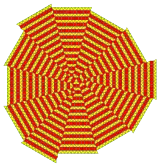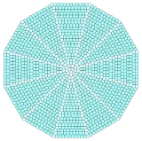 Sections of stacked triangles and squares can be combined into radial forms. This mixes two vertex configurations, 3.3.3.4.4 and 3.3.4.3.4 on the transitions. Twelve copies are needed to fill the plane with different center arrangements. The duals will mix in cairo pentagonal tiling pentagons.[3]