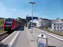 Elsterberg station was opened on 8 September 1875. It is the first station in Saxony towards Weischlitz. The station in the north of the town has, besides an entrance building, a staff residence, a freight shed and two signal boxes.[11]