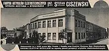 In 1925, the company significantly increased its share capital thanks to the funds brought by industrialist Mieczysław Kutnicki:[2] on September 20, 1925, the venture was registered under the name "Fabryka Artykułów Elektrotechnicznych inż. Stefan Ciszewski i S-ka, Sp. z o. o.". A new factory was built at 1 Jana III Sobieskiego street[4] and in 1933, began the production of thermosetting plastic mass.[5] This year, the company sponsored the creation of a sports club, the Ciszewski Bydgoszcz (1933-1939).[8] The latter achieved certain success in football ("Spartan Club"-Pomeranian vice-champion) and in basketball (Pomeranian champion), hence publicizing the firm.[4]