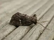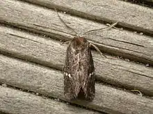 The forewings are brown with a small mark near the middle of each forewing. The hindwings are pale brown.