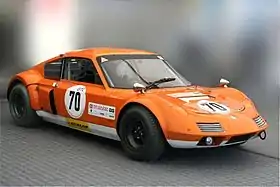 There was also a GT160 which never got beyond production of three prototypes. It used a BMW dry sump engine of 2 litre capacity with bodywork styled by Englishman Trevor Frost (also known as Trevor Fiore, and who also designed the Trident) and made by Carrozzeria Fissore of Turin.[43] It weighed 11 long hundredweight (559 kg) and had 185 bhp (138 kW; 188 PS) so would have had very impressive performance but was deemed too costly to put into series production. The car was shown at the London Motor Show in 1964.[44] One of the cars was purchased by Richard Wrottesley and entered in the 1965 24 Hours of Le Mans. Co-driven by Tony Lanfranchi, the car retired early in the race.