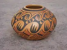 Nampayo became an expert at decorating and painting pottery. She specialized in black and red on yellow bowls and jars with traditional migration designs and eagle motifs. Her pieces most often resembled the works of her mother and grandmother. On occasion she could be persuaded to break from tradition and try some designs of her own invention.[3] Elva took great pleasure in making pottery and could form as many as eight pots a day.[3] During her later years, her daughter Adelle would assist her in polishing, decorating and firing her pottery. Nampeyo signed her pottery as "Elva Nampeyo" followed by the corn clan symbol which was initiated by her mother Fannie.[2]