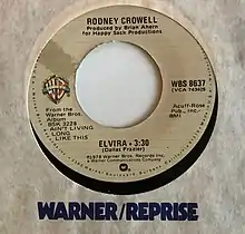 Frazier's version peaked at No. 72 on the Billboard Hot 100, and was a top 40 hit in Canada, reaching No. 27.[2] A number of other artists recorded the song through the years with varying degrees of success, most notably Kenny Rogers and the First Edition.[3] Rogers' version appeared on the album Something's Burning, which reached the top 30 of the Billboard 200. In 1978, alternative country recording artist Rodney Crowell recorded his cover of "Elvira" (with "Ashes by Now" on the B-side).[4] Crowell's version hit No. 95 on Billboard's country chart.[3]