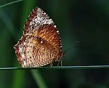 The palmflies are a common Asian butterfly genus found from India to the Solomon Islands. The caterpillars mimic leaves which they feed on. The adults mimic certain species (for example: E. cumaea looks like Melanitis leda).