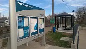 Elyria station is an Amtrak station in Elyria, Ohio. Located at 410 East River Road, the building is a small bus stop-type shelter.