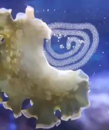 Newly hatched E. crispata demonstrate a dispersal dimorphism, not to be confused with poecilogony.[8] Babies can either undergo intracapsular metamorphosis, or post-hatching metamorphosis, giving E. crispata variation in their dispersal strategy.[8] This allows some clutches to remain stationary to that habitat, or allowing them to swim to a new habitat before metamorphosing.[8] Some species of Sacoglossan such as Elysia tuca, invest extra energy to create extra-cellular yolk which is weaved into their egg mass, providing a greater abundance of nutrients for larval growth, which in turn produces larger progeny.[8] E. crispata, however, does not produce extra-cellular yolk, which affects the size of the eggs.[8]