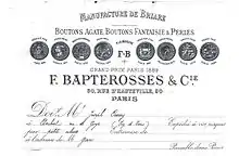 Bapterosses & Cie was bent on efficiency and multiplied inventions to boost productivity.[4] For instance in 1858 (US letters of patent N°19,120), they invented buttons with shanks.[5][6] Mr Bapterosses was also a precocious marketing man in the sense that he immediately advertised his products under the FB brand [7] and associated it with the numerous medals & awards he had received the world over.
