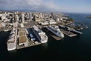 The Embarcadero is home to the San Diego cruise ship terminal, the museum ships USS Midway at Navy Pier and Star of India, seven other historic vessels belonging to the San Diego Maritime Museum, and various restaurants and shops from the North Embarcadero down through Seaport Village. In 2010, the Port completed a redevelopment of the historic Broadway Pier to create the Port Pavilion, a second cruise-ship pier and terminal.