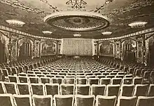 The auditorium's ceiling is mostly flat but is designed with plasterwork in low relief.[13] The center of the ceiling has a wide recessed dome, which is surrounded by eight smaller brass-and-crystal lighting panels.[24] The central dome is surrounded by gilded filigree decorations, which were subsequently painted cream to match the surrounding ceiling.[30] Rambusch Studio designed the lighting fixtures.[4][30] According to Exhibitor's Trade Review, the lighting fixtures were designed specifically for the theater, with a mixture of direct and indirect lighting.[16]