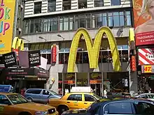 The renamed Embassy Newsreel Theatre saw six or seven thousand visitors per day in its first two weeks as a newsreel theater.[68] The newsreels were completely changed every week,[69] and the theater was on the heavily traveled Times Square, adding to the Embassy's popularity.[61] By 1930, Movietone's editor E. L. Harvey said the Embassy had "far outgrown its original plans" of being "a show window on Broadway for Fox News".[70] The Embassy's newsreels included the first sound reel of a whale being captured;[71] a tribute to U.S. president Calvin Coolidge;[72] the rise of Adolf Hitler;[73] appearances by Pope Pius XI[74] and J. P. Morgan Jr.[75] and the trial and sentencing of several men who kidnapped oil magnate Charles F. Urschel.[76] Fox Movietone published advertisements saying, "The Embassy Newsreel grossed more than $11,000 in a 550-seat house showing only Fox Movietone News."[60]