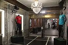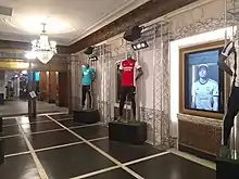 Two sets of double doors lead from the entrance to the outer lobby. Each door is made of bronze with 20 glass panes; a transom window runs above the doors. The outer lobby's floor consists of black tile squares, separated by a grid of white marble.[8] The space includes veined marble walls[8][9] with wainscoting and illuminated sign displays.[8][10] As of 2019, the walls contain freestanding and wall-mounted truss structures[10] with displays of sport wear.[3] A plasterwork frieze, containing motifs of medallions and swags, runs at the top of the walls. The coved ceiling is surrounded by a molded band and contains two overhanging brass-and-crystal chandeliers, as well as ceiling vents for air conditioning. The outer and inner lobbies are separated by two brass-and-glass double doors, similar to those between the entrance and the outer lobby.[8]