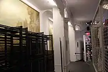 Behind the piers are six murals painted by Arthur Crisp.[4][9][27] The six murals are decorated with architectural subjects.[9] Two additional murals formerly existed near the proscenium, flanking the organs there.[9][11] The organ itself was a three-manual console, leased for two years from M. P. Möller from 1925 to 1927.[28] By the late 1980s, the two murals near the proscenium had been removed, while the remaining murals were in poor condition. The two murals near the rear of the auditorium were visually divided by a sound wall, although they remained physically intact.[11] The remaining murals were restored in 2019 as part of the Pele Soccer store's construction.[23] The westernmost mural on the north wall had been damaged, so a freestanding sign describing the theater's history was placed in front of the damaged mural.[29]