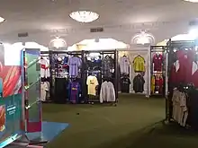 The former auditorium is accessed from the inner lobby and was designed with a single level of seating. There was neither a balcony nor boxes.[5][13][15] Originally, the auditorium had 598 seats,[17][18] later cited as 582.[19] The original seats contained tapestry coverings; lacquered carmine-colored arms; and lacquered black-and-gold seat backs.[14] Aisles ran along each side of the auditorium.[9] The room has a slightly raked floor that slopes down toward the proscenium arch on the east wall.[20] The Pele Soccer store's floor is largely a flat surface placed on footings above the raked floor, which is still extant.[21] The store's raised floor is designed to resemble a soccer field.[3][22] To the north and south of the raised floor are ramps that are actually part of the original raked floor.[21]