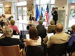 Besides a series of cultural events at the embassy's space, which include concerts, film screenings, plays, panel discussions, lectures, wine tastings, cooking lessons, tourist promotions and at least five exhibitions a year, the embassy presents many of its events in collaboration with other embassies and consulates, non-governmental and nonprofit organizations, Slovenian societies and clubs in the U.S., universities and other partnering organizations, such as the Embassy Series, the Kennedy Center, U.S. Library of Congress, National Gallery of Art, Hill Center, Hillwood Museum and Gardens, Listner Auditorium, the Phillips Collection, International Club of DC, Word Artists Experiences etc. In the recent years percussionists Jože Bogolin and Simon Klavžar, saxophonists Jan Kus and Igor Lumpert, Carmina Slovenica choir, N'Toko, Grammatik, flutist Matej Zupan, clarinetist, Jože Kotar, trumpeter Franc Kosem, violinist Vasilij Meljnikov and Gorjan Košuta, violist Franc Avsenek, cellist Miloš Mlejnik and Sebastjan Bertoncelj, pianists Hinko Haas and Nejc Lavrenčič, soprano Irena Preda, multimedia artists Neja Tomšič, Irena Tomažin, Miha Ciglar and Martin Bricelj Baraga, writers and poets Evald Flisar, Aleš Šteger, Andrej Blatnik, Gabrijela Babnik, Tone Škerjanc, Jela Krečič, Maja Haderlap and Cvetka Lipuš, philosopher Slavoj Žižek, architects Marjetica Potrč and Dean Lah, film makers Darko Herič, Žiga Virc, Tina Lešničar, Davorin Marc, film curator Jurij Meden, directors Peter Petkovšek and theatres Mladinsko theatre, Zapik puppet theatre, Fru Fru puppet theatre and puppeteer Nika Solce, dancers Jurij Konjar and Mojca Majcen and others performed in Washington, New York or elsewhere in the U.S. with the support of the Embassy, Consulate General in Cleveland, Department/Lectorate of the Slovene language at Cleveland State University, and 13 honorary consuls in respective states of Colorado, California, Florida, Georgia, Hawaii, Illinois, Kansas Michigan, Minnesota, Pennsylvania, Tennessee and Texas. Just in 2016 the embassy organized around 140 events, trying to embrace all arts, from architectural showcases, film, sculpture, paintings, visual arts, dance, theatre and music. Many of them were dedicated to embrace the 25th anniversary of Slovenia's independence.