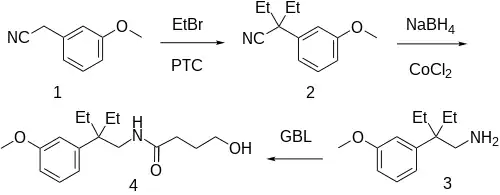 Alkylation of (3-Methoxyphenyl)acetonitrile [19924-43-7] (1) with bromoethane gives 2-Ethyl-2-(3-methoxyphenyl)-butanenitrile [40692-21-5] (2). Sodium borohydride is used to reduce the nitrile group to give 2-ethyl-2-(3-methoxyphenyl)butan-1-amine [93309-48-9] (3'). Amide formation via reaction with gamma-butyrolactone completed the synthesis of embutramide (4).